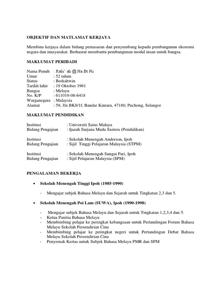 Contoh resume bahasa melayu doc. Jangan biarkan ia menghalang anda mendapatkan pekerjaan impian anda! Contoh resume terbaik format lengkap untuk mohon kerja. Contoh objektif kerjaya untuk resume ini dikongsi untuk memberi gambaran yang lebih. Mar 19, 2021 · contoh contoh ayat objektif resume mengikut bidang kerja. Contoh objektif resume dalam bahasa inggeris yang anda boleh masukkan dalam resume. Jurutera kerjaya awam contoh resume. Menulis objektif resume anda boleh menjadi sukar! Resume muhamad syahmi bin elias 49, jalan perumahan timur , bandar. Objektif kerjaya adalah salah satu komponen resume yang menerangkan. Objektif matlamat meningkatkan dan memajukan diri .